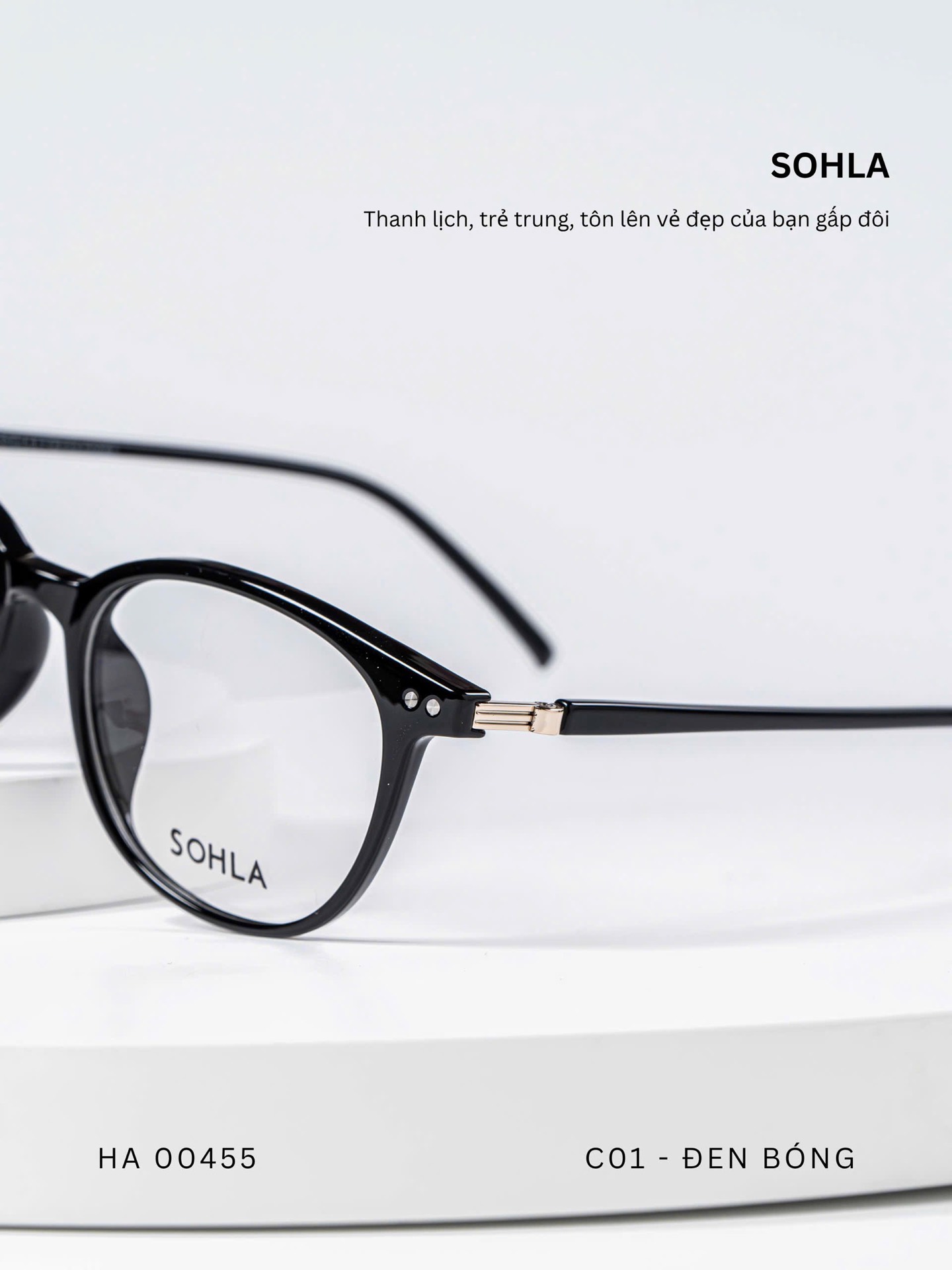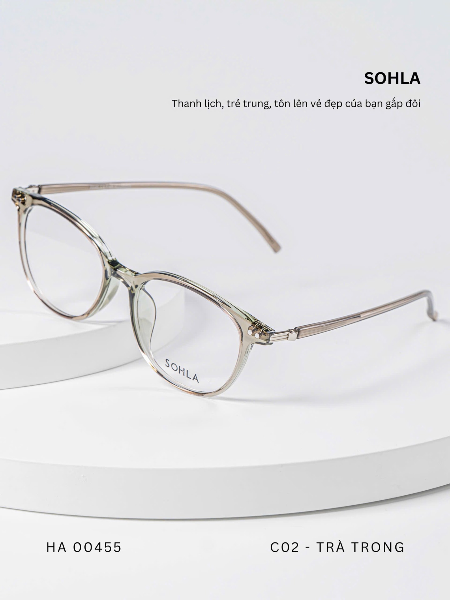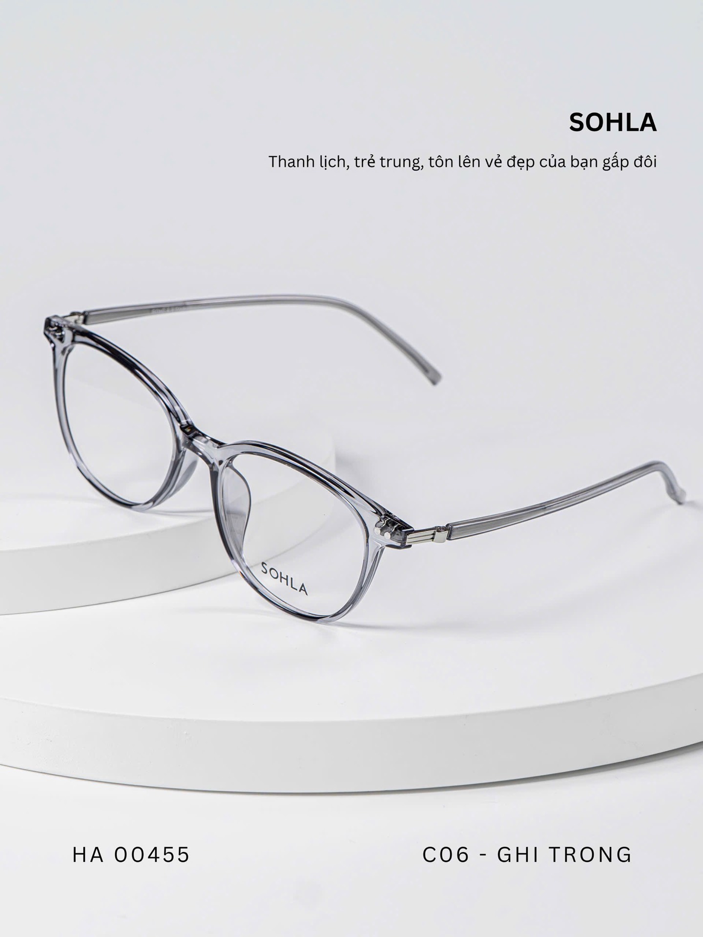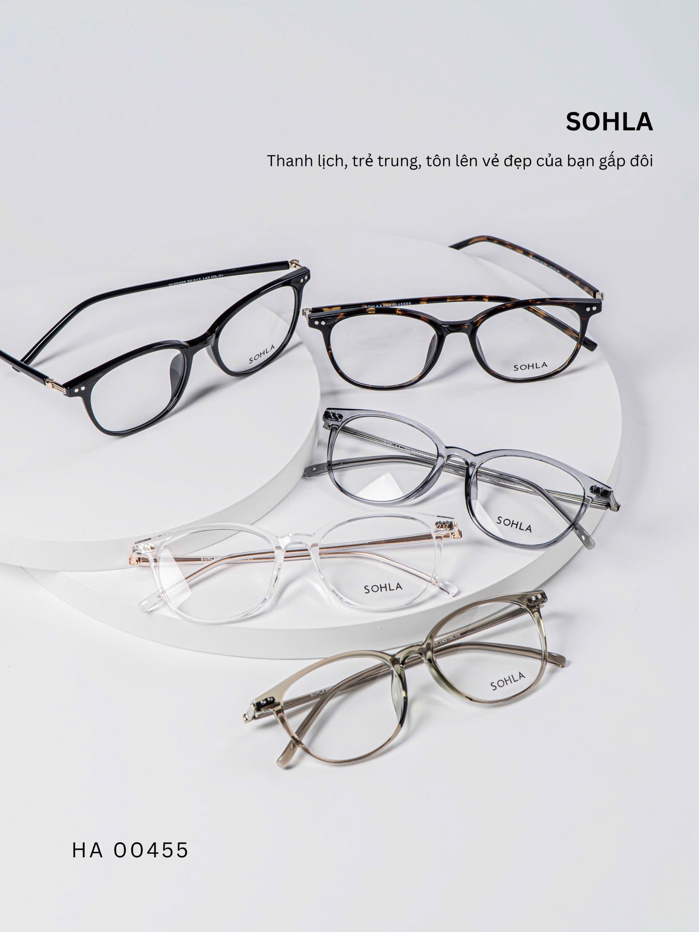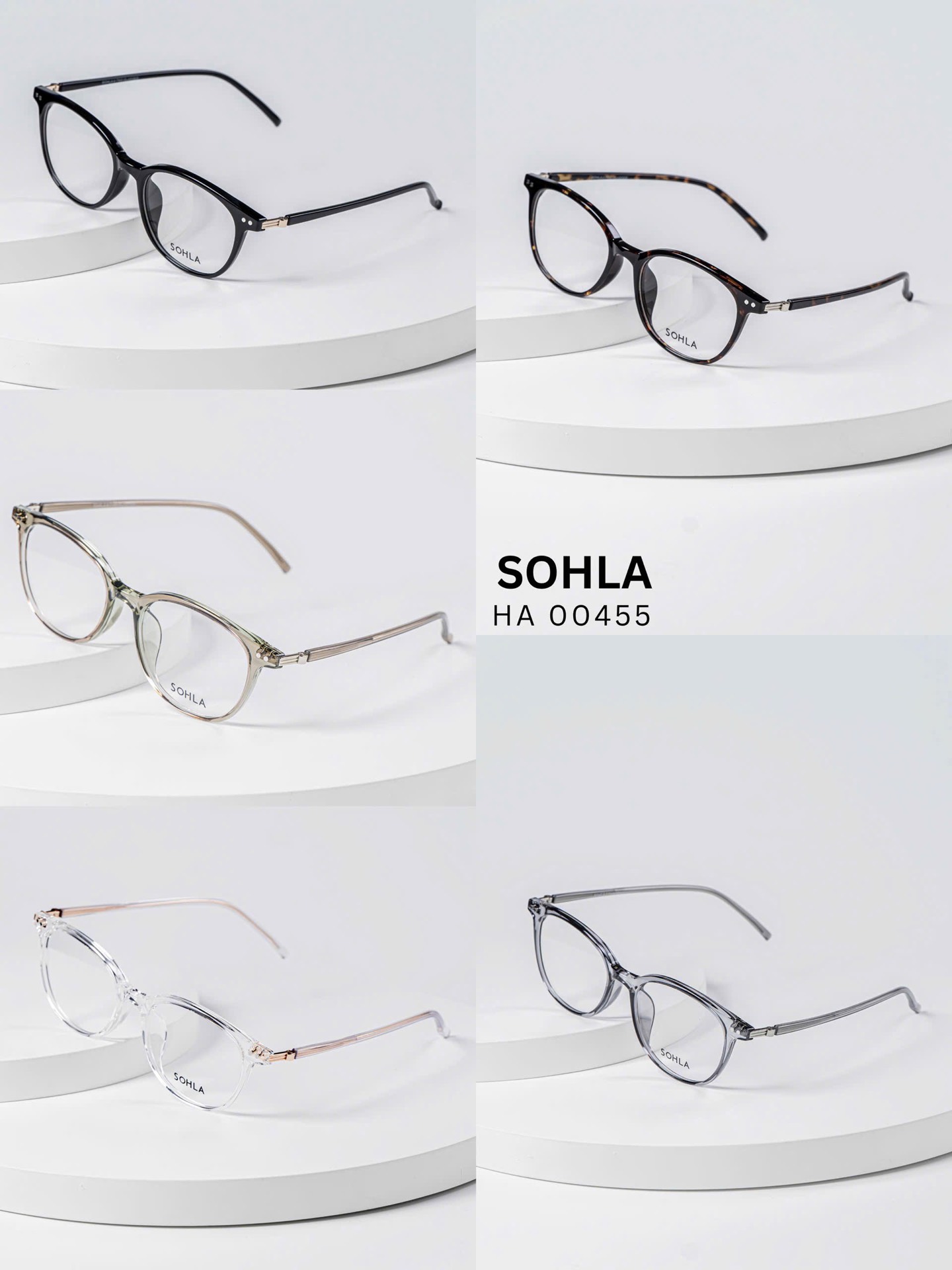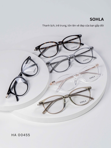 Đen bóng/ Đồi mồi tối / Trà trong / Ghi trong / Trắng trong – bảng màu trẻ trung, đa dạng. Các tone trong và bán trong suốt mang lại hiệu ứng nhẹ nhàng, giúp tổng thể khuôn mặt sáng hơn và dễ phối với nhiều phong cách khác nhau.