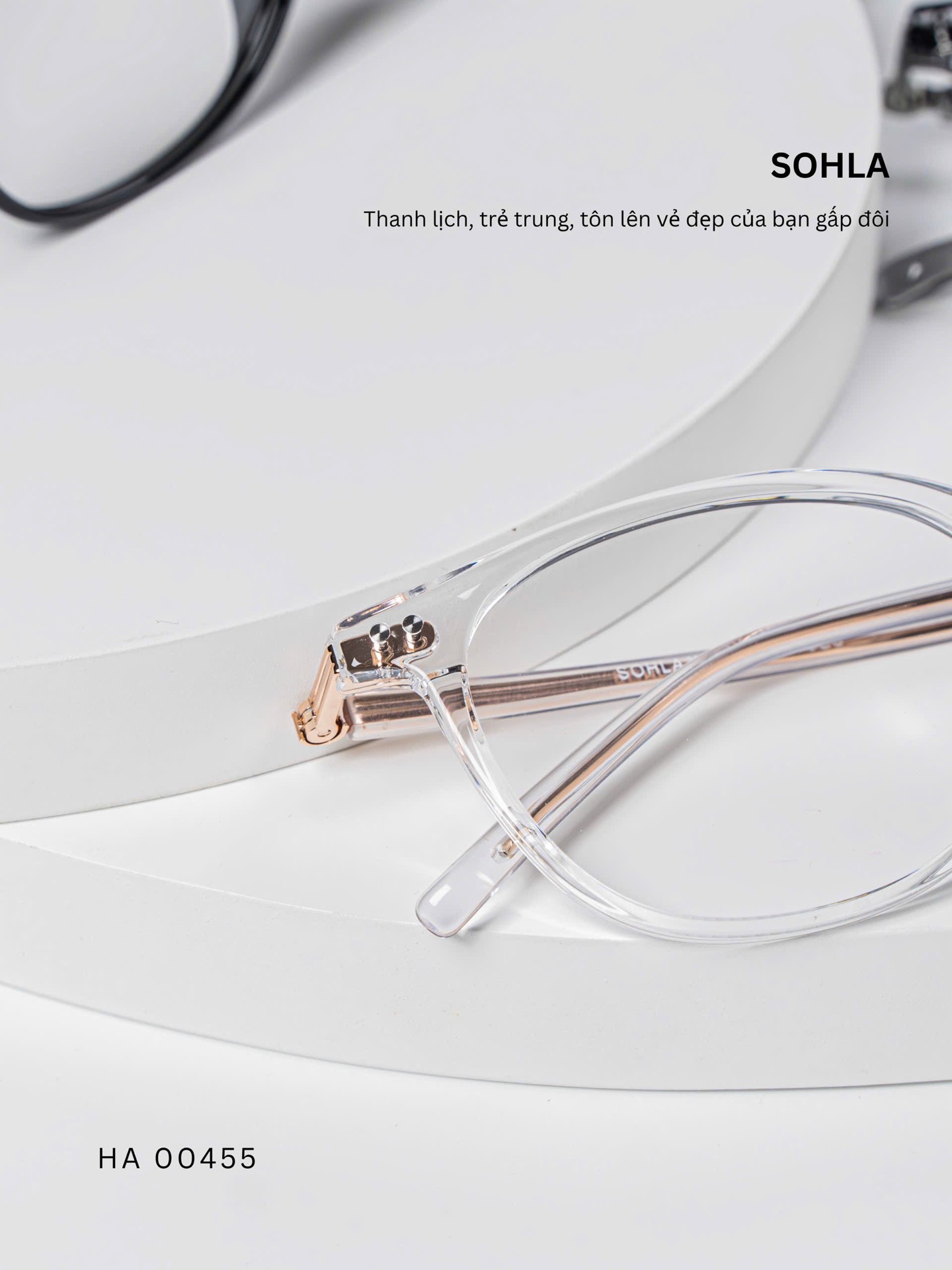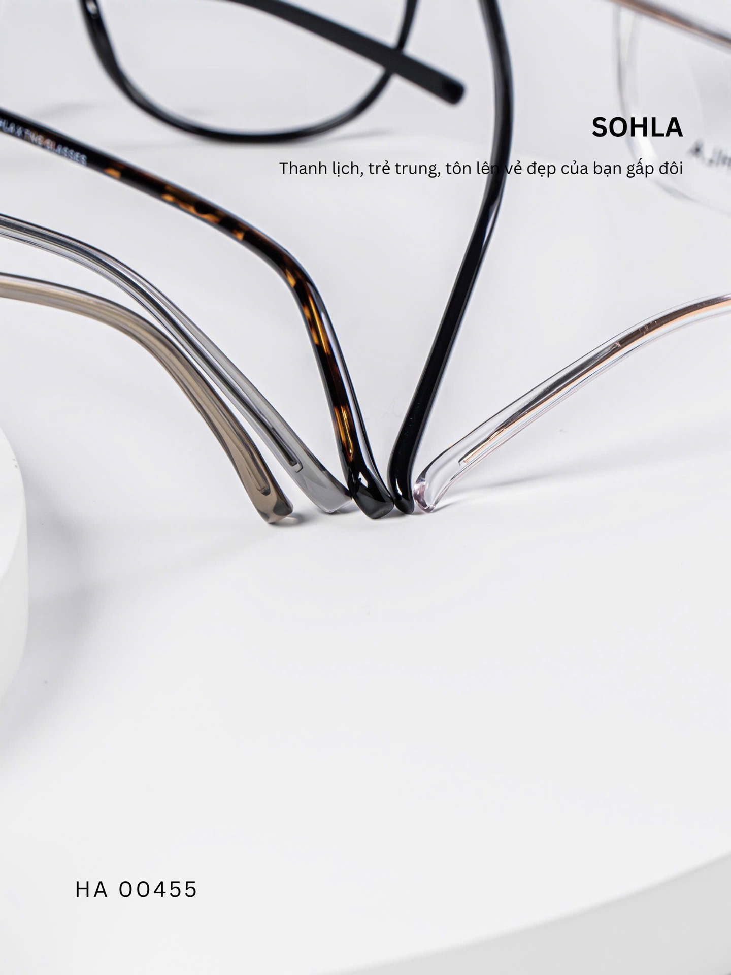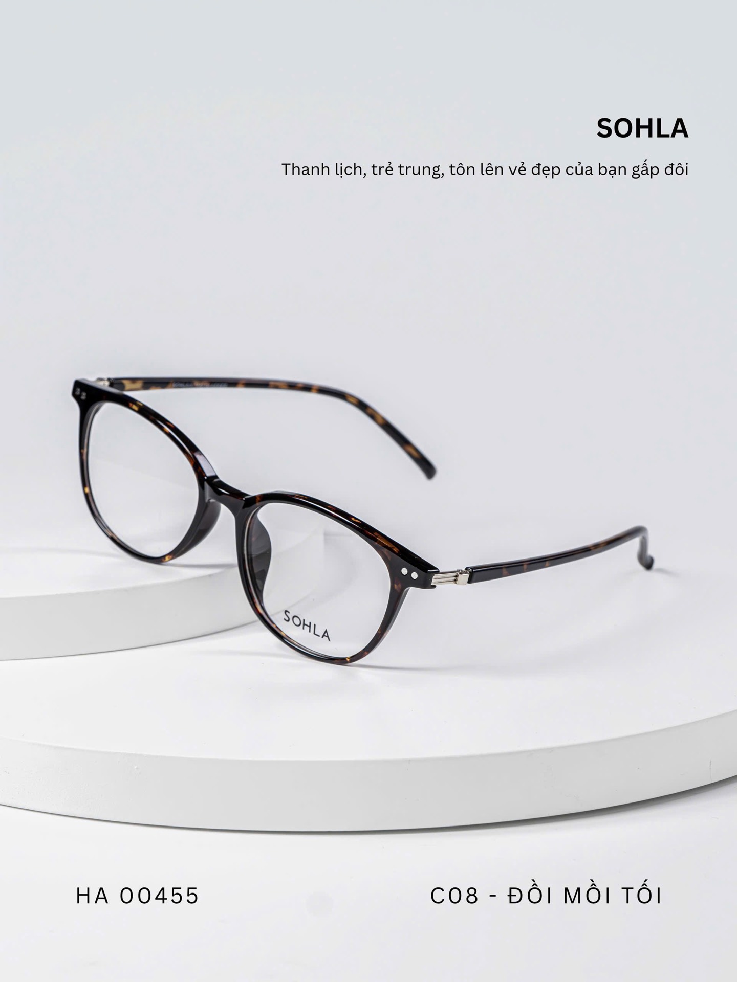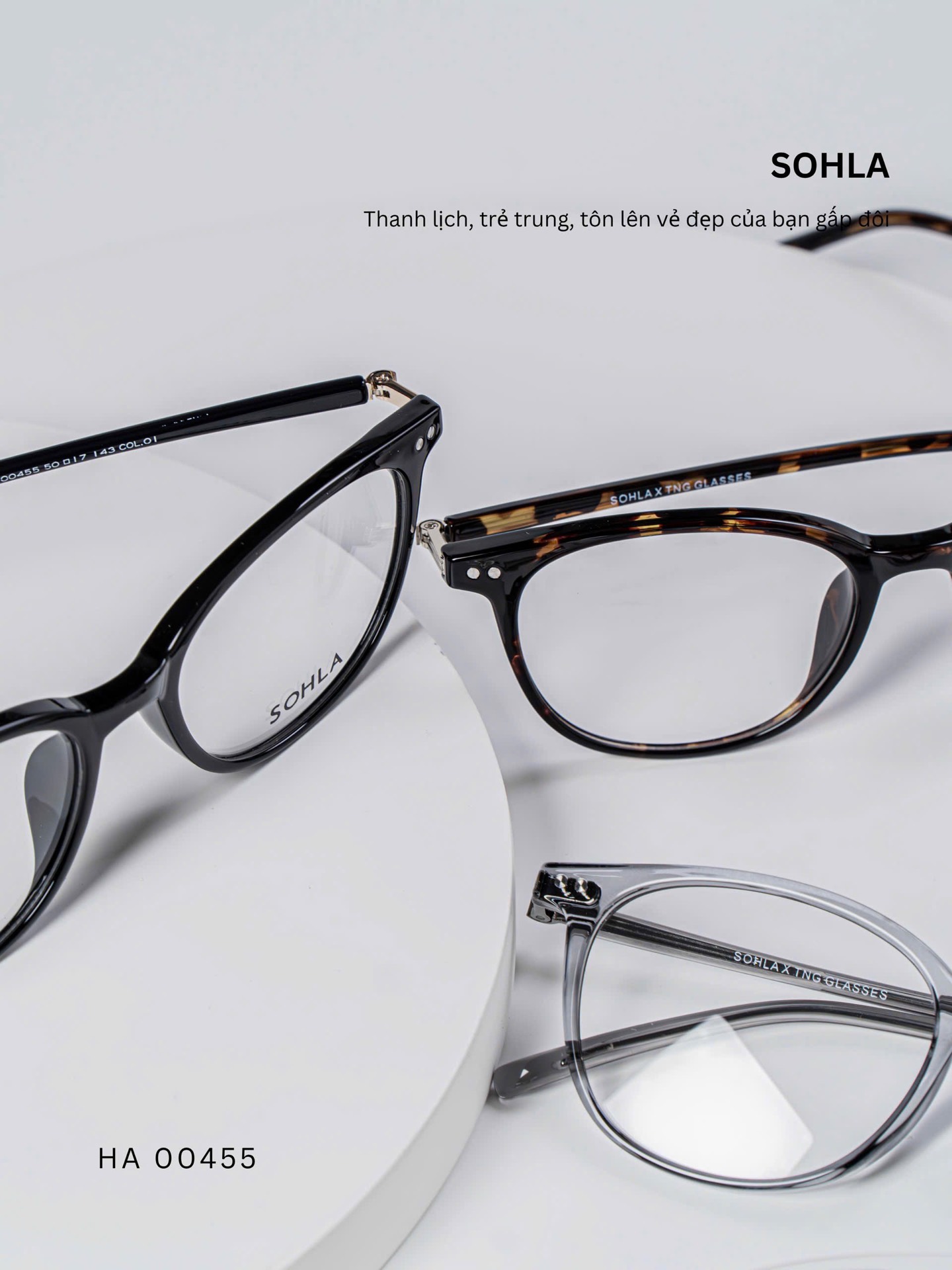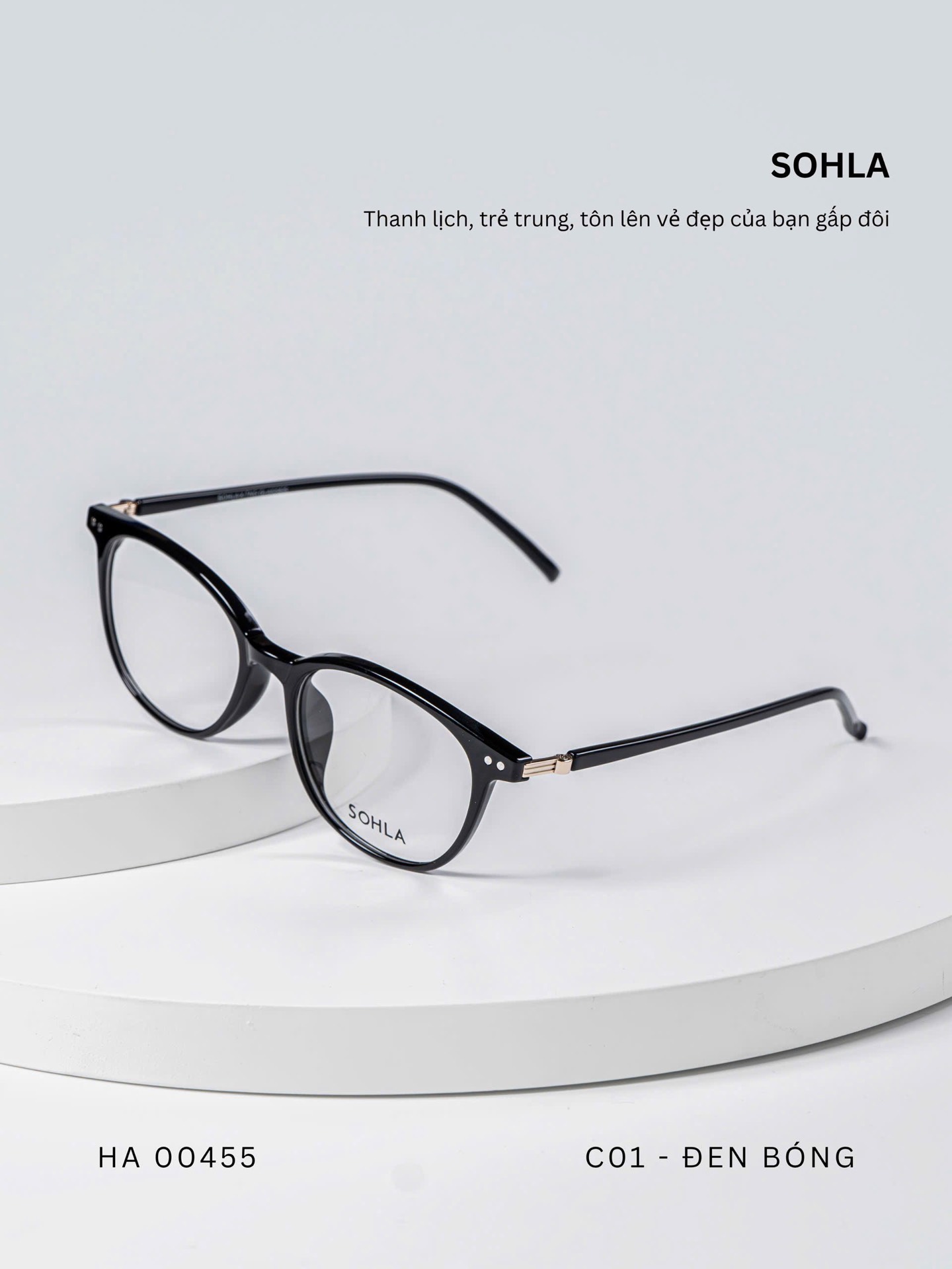 Đen bóng/ Đồi mồi tối / Trà trong / Ghi trong / Trắng trong – bảng màu trẻ trung, đa dạng. Các tone trong và bán trong suốt mang lại hiệu ứng nhẹ nhàng, giúp tổng thể khuôn mặt sáng hơn và dễ phối với nhiều phong cách khác nhau.