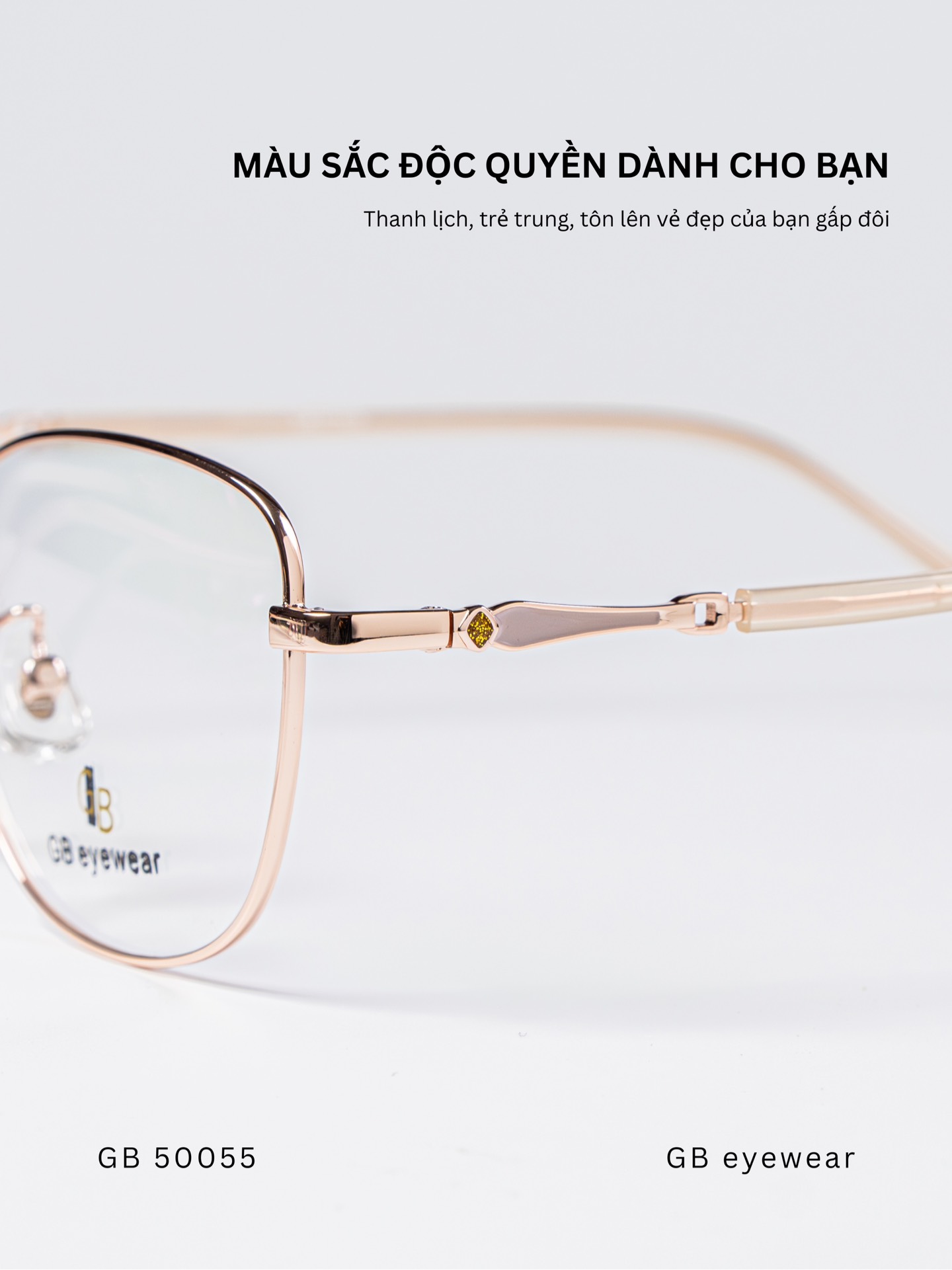 Gọng kính dáng đa giác bo nhẹ, đường nét thanh mảnh tạo cảm giác hiện đại và gọn gàng. Thiết kế form cân đối giúp khuôn mặt trông hài hòa, phù hợp với nhiều dáng mặt khác nhau.